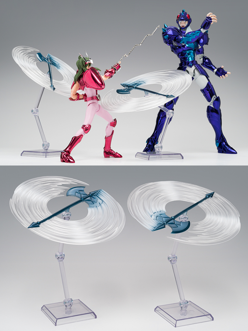 這款聖衣神話的天璣星巨蟒索爾,其高度約25公分,是系列中尺寸最大的,這也是為了反映他在動畫中的巨人身形。表情零件共有四種可以替換,兩把巨大戰斧除了有特效件可以搭配展示之外,也可以裝備在身上。另外還有可替換的手部零件四組。