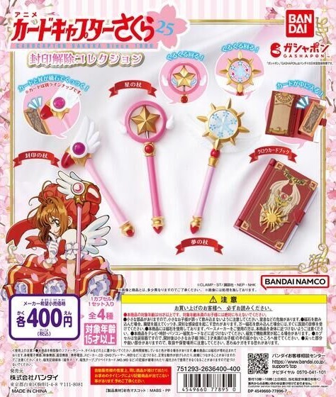 「GASHAPON 庫洛魔法使 封印解除collection」轉蛋,將小櫻所使用的魔法杖以及卡牌收藏冊以微縮尺寸迷你再現,收錄有:封印之杖、星之杖、夢之杖以及封印卡冊(附風卡牌),除了精緻的塗裝與細膩的造型之外,更在細節處有小巧思設計,包含封印之杖前端的磁鐵、星之杖可以旋轉的星星等,封印之書更是能將卡牌收藏其中的可動設計!