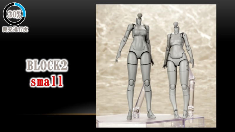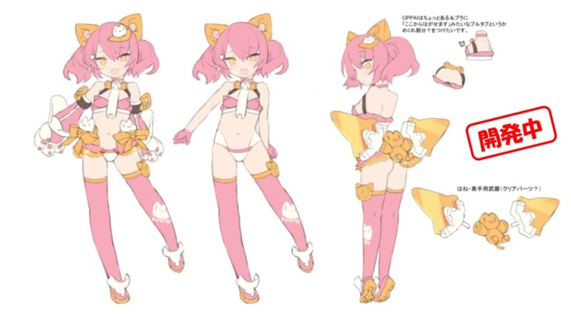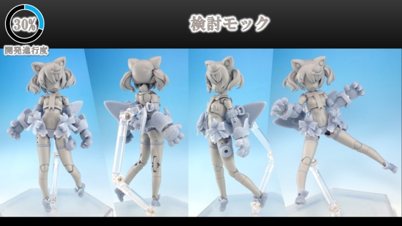 這款「BLADE型女神(暫名)」目前開發進度約 30%,採用新型素體「BLOCK2」的低身高版本進行開發,還原 BLADE 所設計的嬌小可愛體型,同時保有具備肉感的體態。武裝造型則運用大量的貓咪元素進行設計,包含貓耳頭飾、貓掌手套、臀部的貓咪武器架,甚至連髮飾、領帶、緞帶都是滿滿的貓咪,造型非常可愛。