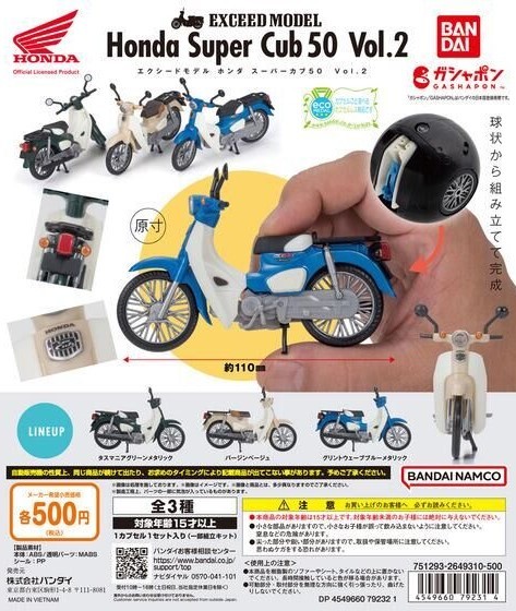 主打超越一般轉蛋水準細緻度的「EXCEED MODEL」系列,結合轉蛋的球體結構,將轉蛋設計為可以組出高約 11 公分、具備精密細節的「EXCEED MODEL Honda Super Cub 50 Vol.2」,以 1/17 比例再現全球暢銷的本田小狼~第二彈收錄有2022年發表的新色車款:塔斯馬尼亞金屬綠、閃爍海浪金屬藍、無垢米白三種配色,除了機械結構,車殼上的貼紙與標誌等也精密呈現~本田小狼迷必須入手!