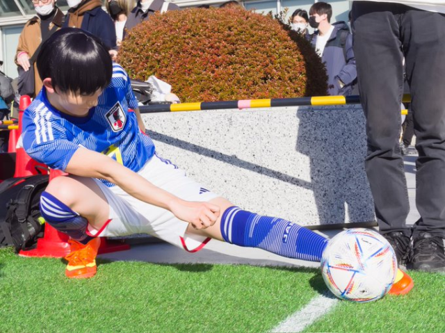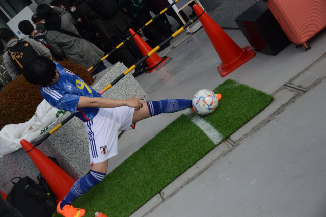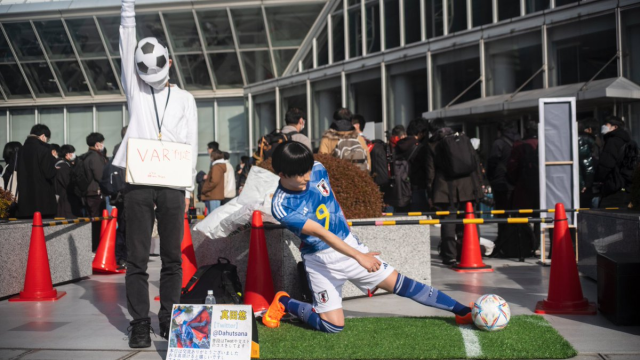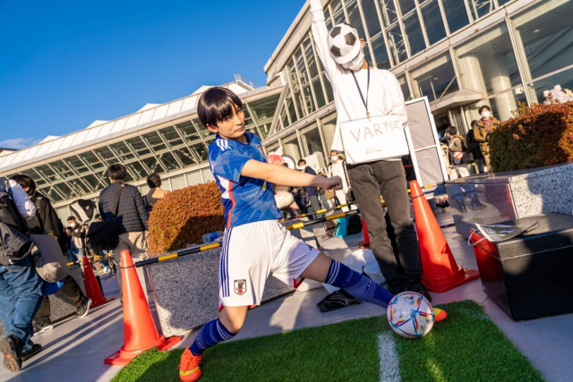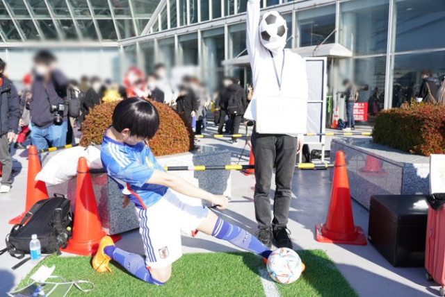 而選擇 Cos 這球的真田悠,是出身名古屋的 Coser,因為對於足球賽熱愛,這次決定選擇這個堪稱日本今年最讓人震撼的經典一球來表現,除了還原足球場的場地跟球外,身穿三笘薰的球衣並擺出那把球救回的姿勢,配上旁邊友人擔綱 VAR 裁判的輔助,整個還原到位也讓不少觀眾與網友嘖嘖稱奇。