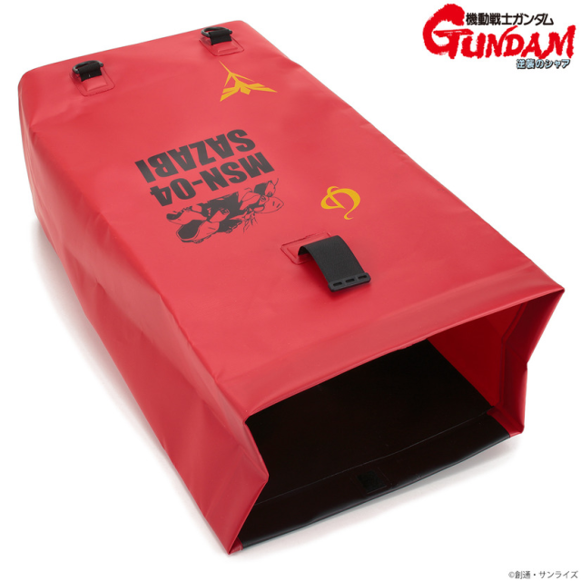 這次的設計,以獨特的無接縫工藝製作,特殊的表面質料可隔絕水和髒污,因此可以將怕被雨水或泥土弄髒的休閒服、靴子、鞋子和裝備放入包中。設計上則將沙薩比& ν 鋼彈兩架機體的編號、特色與圖案放上,搭配各自的色系,超強韌的機能性絕對是各位首選。