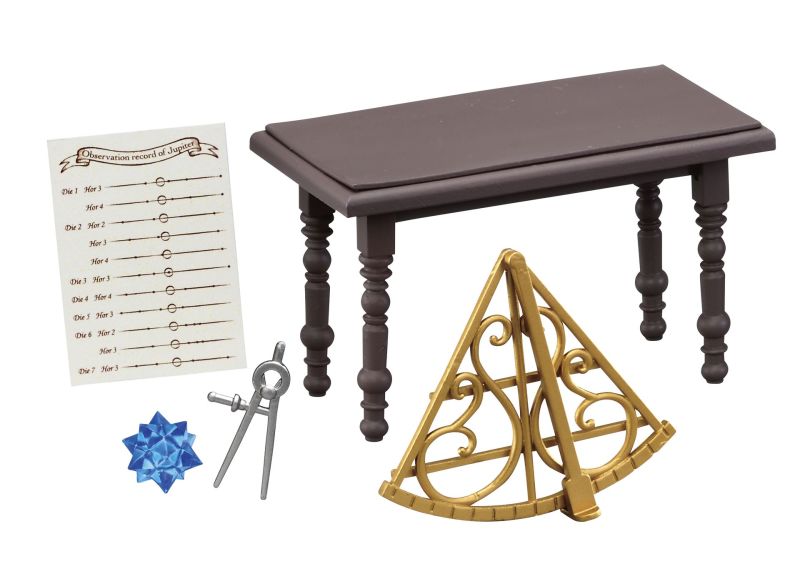 此次推出的最新作要以天文學家的不可思議研究所為主題,不過並不是現代人印象中運用精密觀測儀器的科學家形象,而是在古代許多謎團未解、甚至被認為與魔法搭上關係的神祕色彩。商品中包含古色古香的天文望遠鏡、太陽系儀、星圖...等天文觀測器具以及各種書籍、研究報告、相應的傢俱、寵物犬等豐富的袖珍模型,讓人沉浸在天文學研究星象的浪漫中!