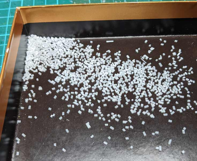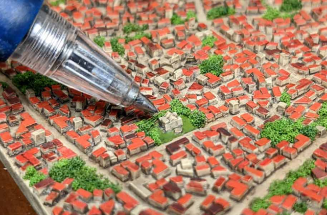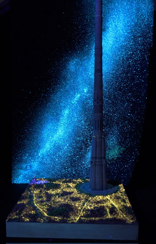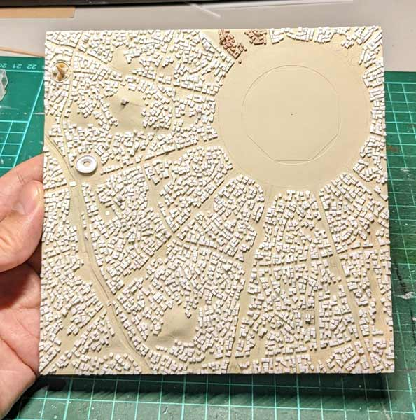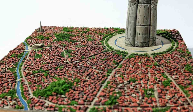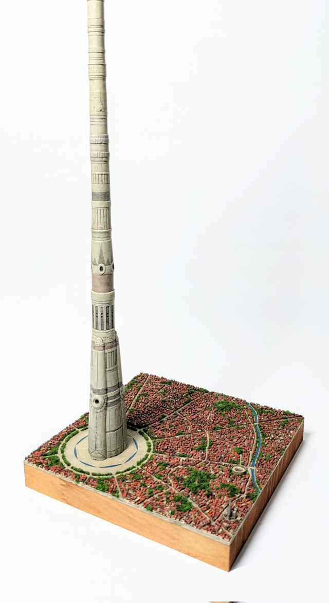 由於巴別塔高大聳立,相對地面的都市房屋場景就非常細小,他決定使用細碎的塑料板來製作。