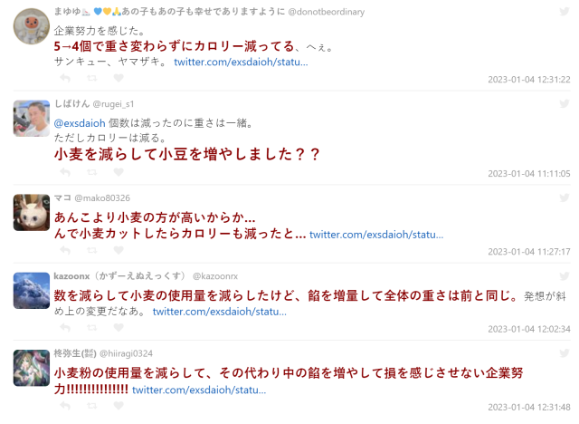 雖然數量少了一個,卻將麵包裡的內餡提升並減少澱粉,也讓不少網友讚嘆山崎麵包的用心。後續山崎麵包也發布新聞稿,表示因為小麥的原物料上漲,才決定用這種方式改變包裝,但是為了滿足消費者,決定把紅豆量補足重量,讓消費者減少剝奪感。