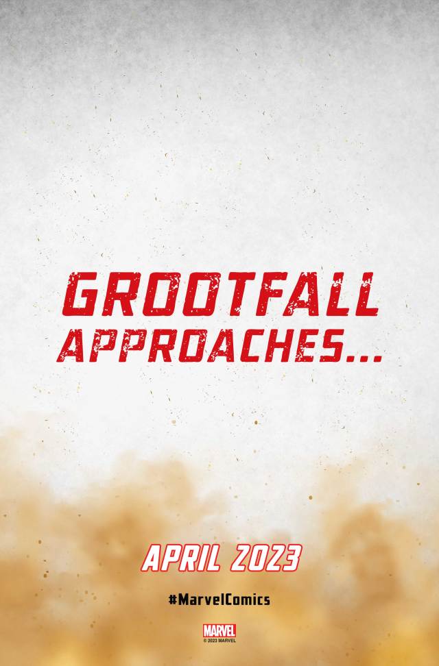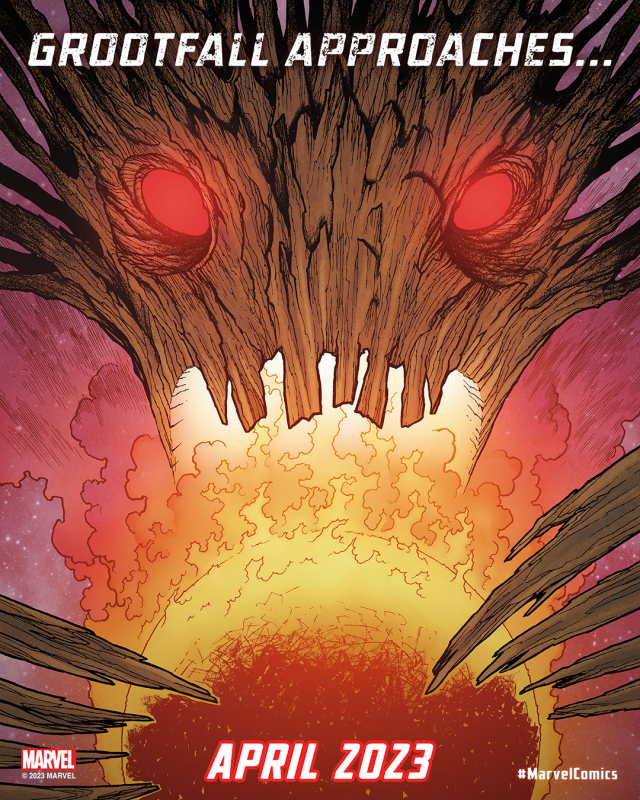將在四月登場的這個故事《Grootfall》名稱可能取自蝙蝠俠的經典故事《Knightfall》,由主角的死觸動了後續的一切事件與新的隊伍。在變體封面上,我們可以看到一個超級巨大的格魯特(Groot)在吞噬、焚燒一顆行星,還是說那才是Grootfall的意思?