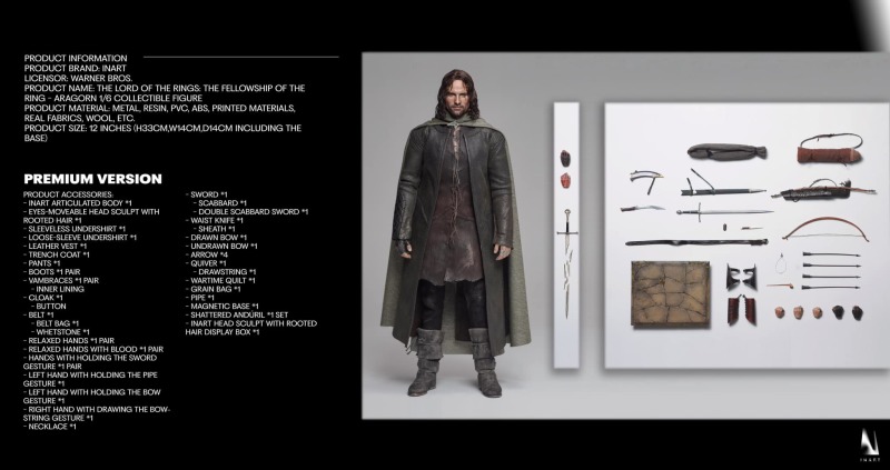 這次以 1/6 比例人偶化的「亞拉岡」全高約 33 公分(含底座),採用金屬、樹脂、PVS、ABS、布料、羊毛......等複合式材料製作,再現了他在首集電影當中身穿的遊俠裝扮,上衣、長版風衣、斗篷、各項裝備所堆疊出來的豐沛層次感,以及服裝寫實的舊化、破損都讓本作極為逼真,配件部分包含手前臂護甲、波羅莫的護手、長劍、子母劍、小刀、弓箭袋、箭矢、弓、煙斗、項鍊、磨刀石......等非常豐富。