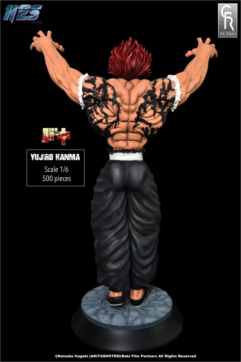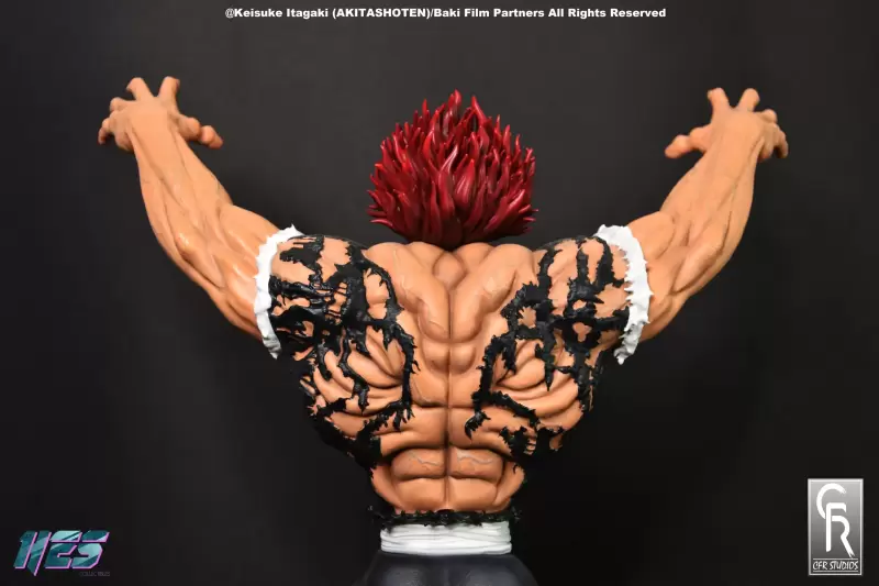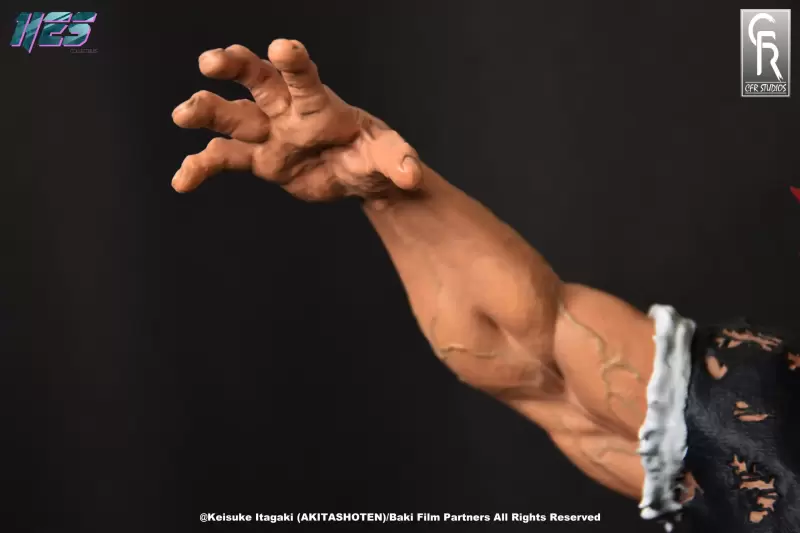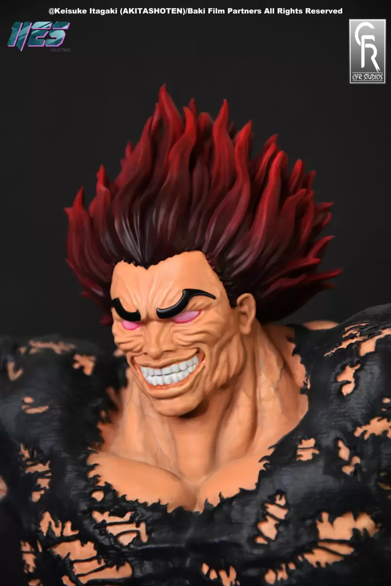 「範馬勇次郎」1/6比例收藏雕像,尺寸全高約 37 公分,為了向他傳奇的戰鬥姿勢致敬,HES COLLECTIBLES 和 CFR STUDIOS 採用範馬勇次郎背部肌肉拉伸到極致時露出如惡鬼面孔般的誇張肌肉造型,將充滿威脅性的姿態立體化。高舉的雙手佈滿逼真的青筋,展現無比驚人的肌肉線條;臉上狂暴的笑容令人不寒而慄,紅色的頭髮施以漸層,並營造出飄逸的動感。已經破裂到如蕾絲般的黑色上衣、纖細腰身與壯碩的屁屁等,都有仔細的刻畫。