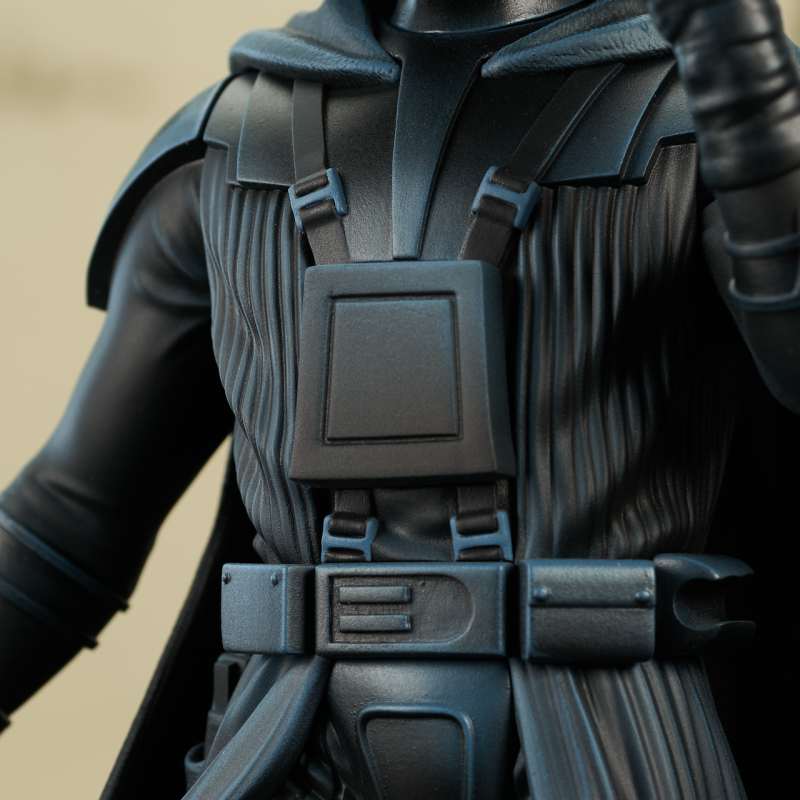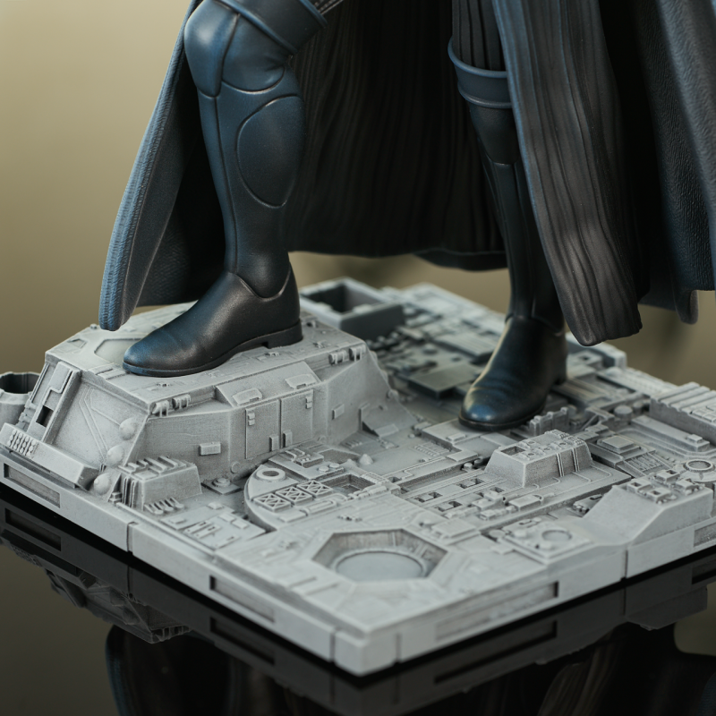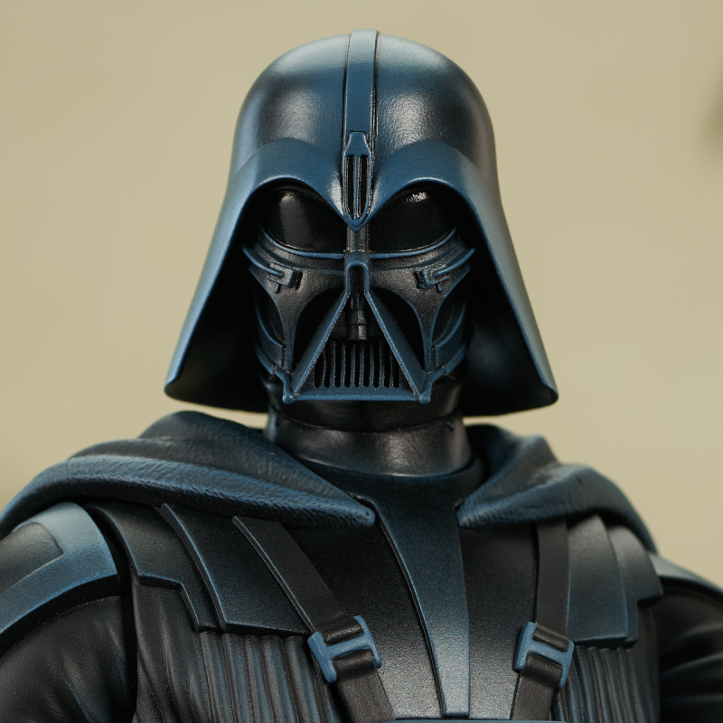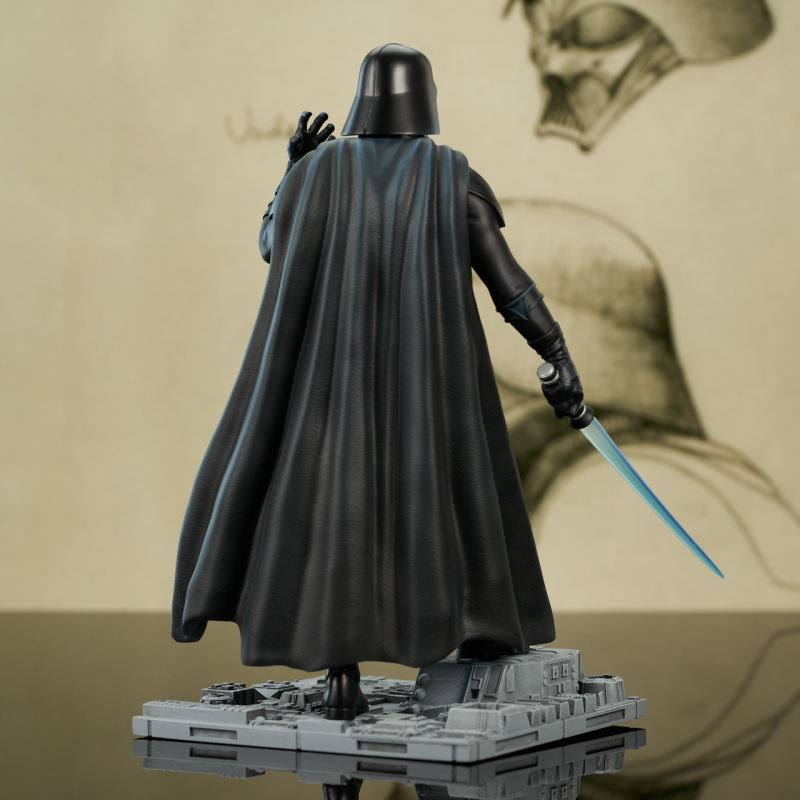 本作高約 11 吋(約 28 公分),整體造型是來自已故概念設計師、插畫家 Ralph McQuarrie,在他筆下的「達斯·維達」擁有不同於我們熟悉面貌的獨特魅力,尤其是頭盔造型與胸口零件的結構,光劍部分則是藍色;這次的雕像呈現出達斯·維達右手持握光劍、左手彷彿正在使用原力的魄力姿態,並細膩形塑出緊身衣的皺褶紋理、護甲的雕紋,以及披風的微微飄動感,頭盔也有兩種版本可以替換,盡顯 Ralph McQuarrie 獨樹一幟的風格,底座部分的細節也相當豐沛,實在是非常迷人的一款達斯·維達啊!