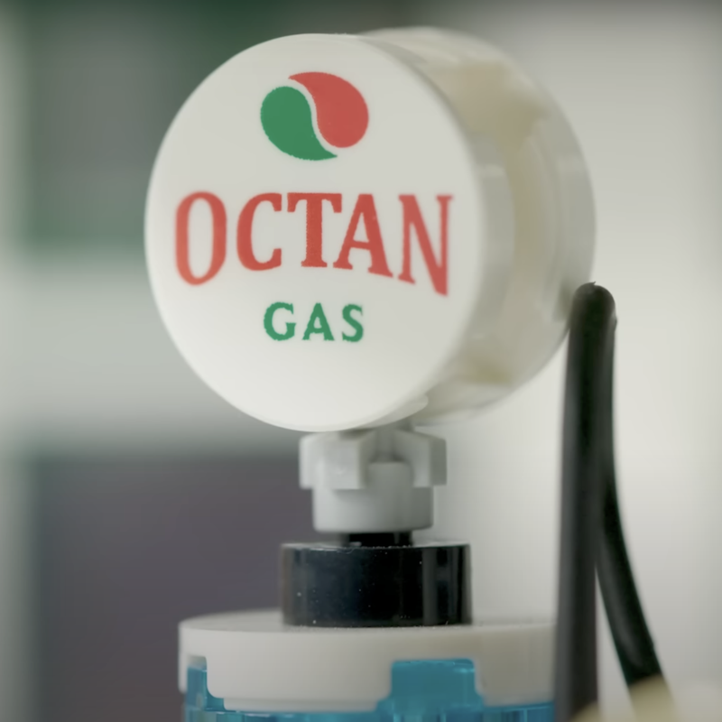 轉角車廠還有兩個有意思的小彩蛋,首先是關於 OCTAN 的石油,OCTAN 是常常出現在樂高城市系列中、與能源有關的公司,最早是在 1992 年登場,在此之前樂高有關於加油站的盒組幾乎都有跟殼牌(Shell)合作的貝殼商標,而在這家虛構的 OCTAN 公司出現之後,關於能源一類的盒組基本上就都以 OCTAN 為主了;轉角車廠這次則是讓這個好久不見的商標再次登場。