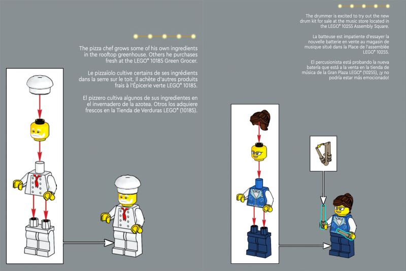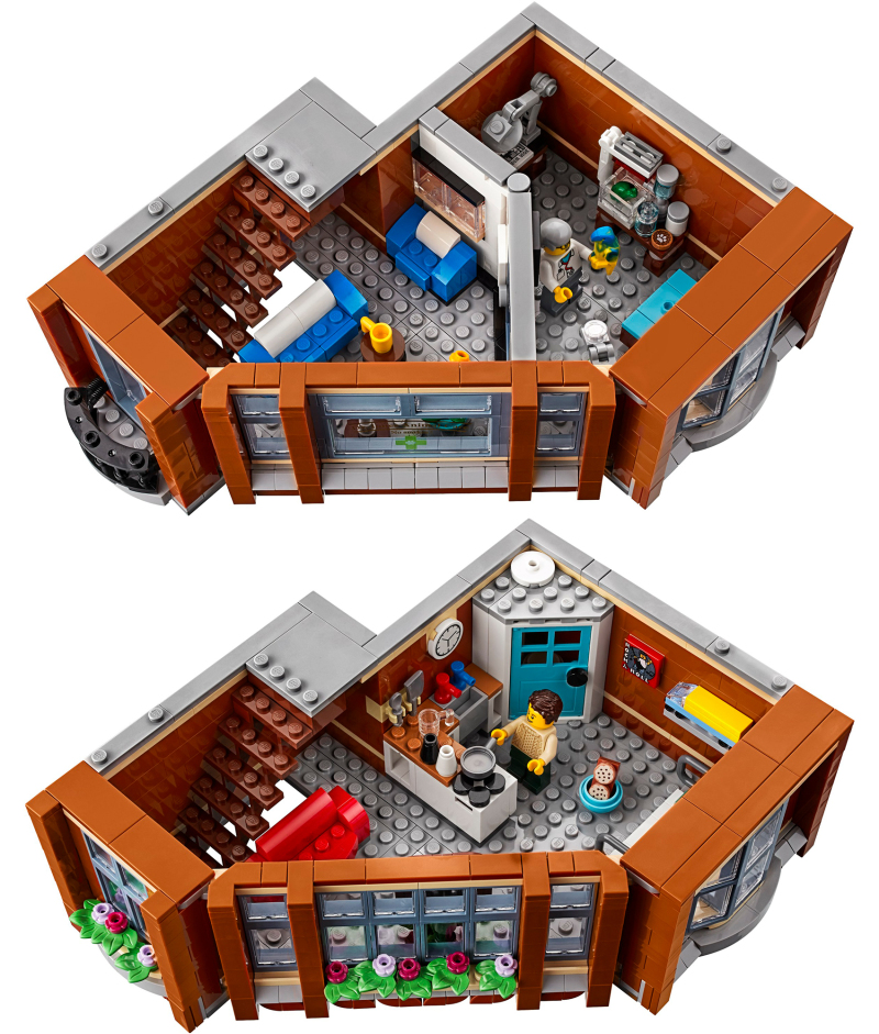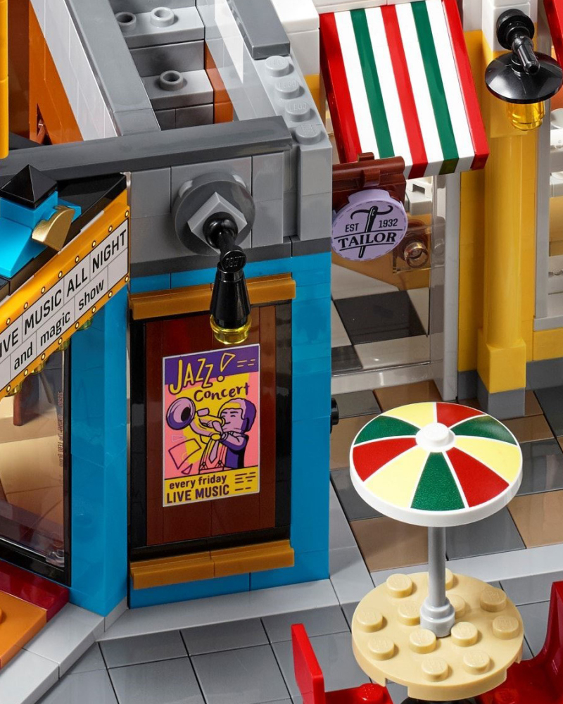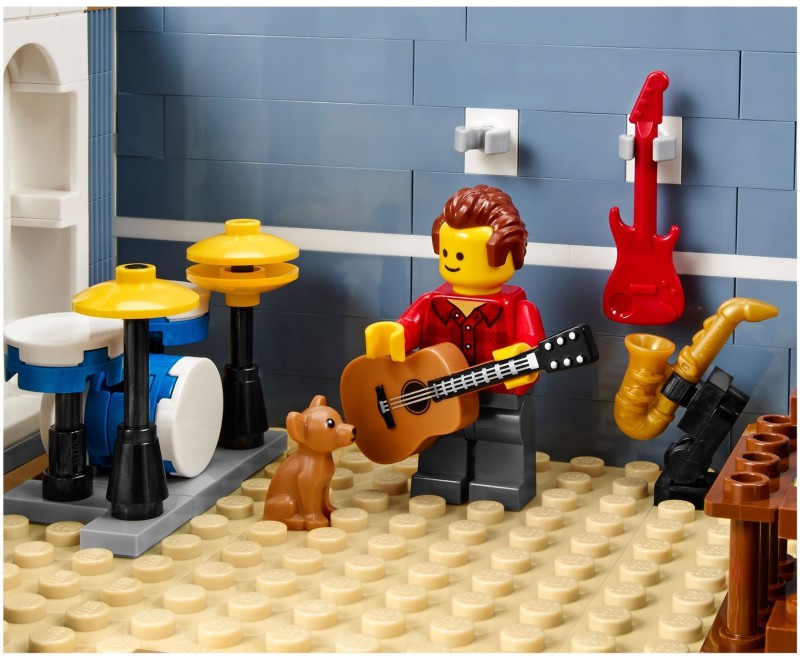 左邊的一樓咖啡店、二樓樂器店、三樓舞蹈教室的外觀分別採用了與「10182 轉角咖啡廳」、「10211 百貨公司」相似的造型,舞蹈教室的鏡子讓人想到偵探社的理髮廳鏡子零件;還可以發現到一個堆滿了樂高跟樂高「轉角咖啡廳」包裝盒的小房間。