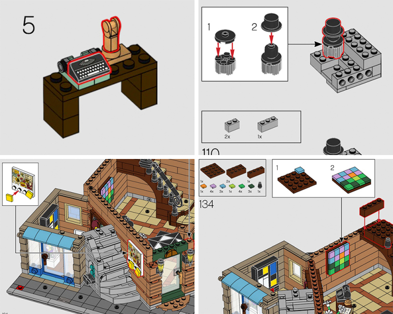 堆砌細節的部分也能發現許多其它街景的元素,像是一樓櫃檯與警察局相同的電話、和綠色雜貨鋪相同堆砌形式的骷髏腳陽台欄杆、與市場大街系出同源的鐵門水管件、會計師人偶同樣也有到磚塊銀行查帳,以及放在藝廊當中、利用透明件拼搭而成的 LEGO CREATOR EXPERT 的標誌,超級酷。