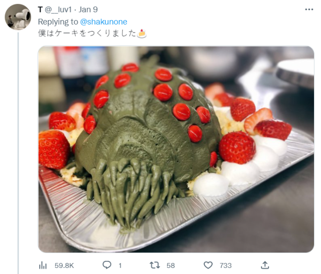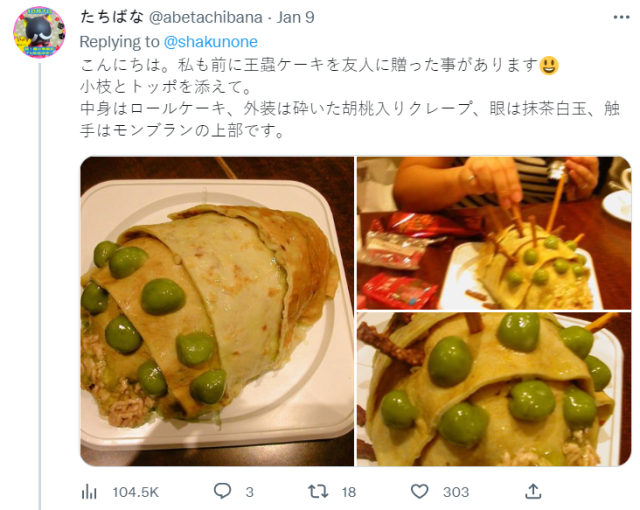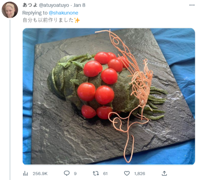 製作的起因是因為推主しゃく無意間跟老婆提到「吉卜力的食物看起來都很好吃 ! 」,結果老婆就動手做飯,結果做出這個成果讓他有點驚訝,原來不是還原原作的食物而是直接把《風之谷》的王蟲作出來。( 不過實際上《風之谷》並非吉卜力工作室作品 )
