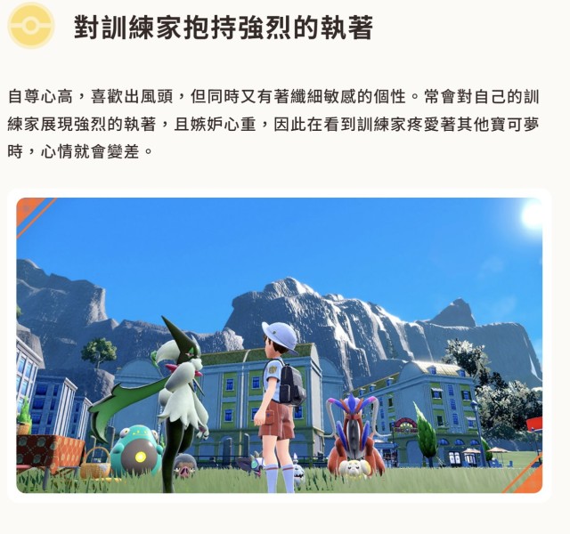 「常會對自己的訓練家展現強烈的執著,且嫉妒心重,因此在看到訓練家疼愛著其他寶可夢時,心情就會變差。」