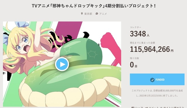 在去年 8 月起播出的動畫《小邪神飛踢》第三季,以可愛的風格搭配作品 10 周年的關係,跟不少日本地方政府合作,許多惡趣味的官方操作更是引起日本網友話題。最近進行第四季動畫企劃的募資活動,募資截止獲得超過 1.1 億日圓,超過目標 3000 萬將近 400%,官方也慶祝並感謝粉絲們的熱情支持。