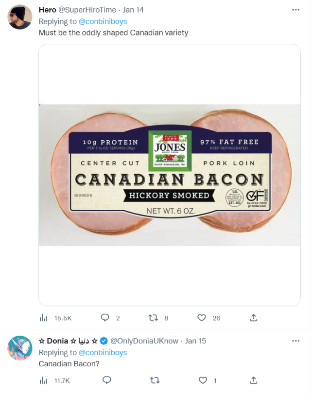 也有網友指出其實不少國家販售的是所謂「加拿大培根」,是以豬脊肉製作的培根,其中切片的鹹肉火腿薄片叫做 rasher。 跟傳統美式的培根又不太一樣,對於某些美國人也覺得怪怪的。