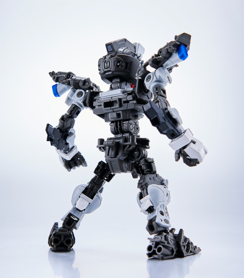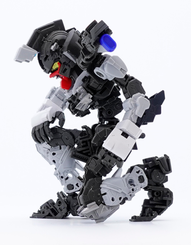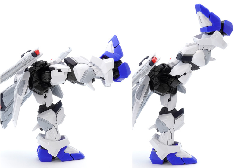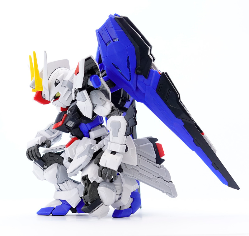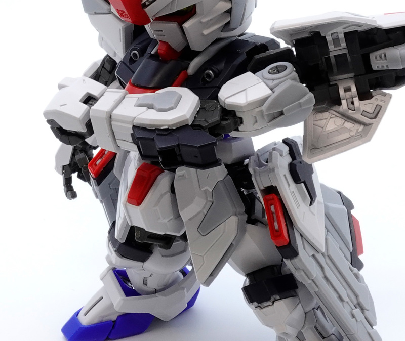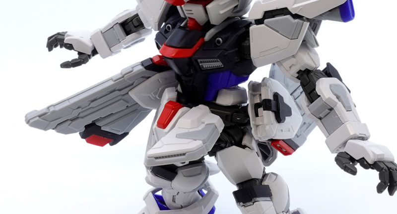 零件數量如此大量的原因,當然就是這款鋼普拉運用 MG 系列培育的技術,在 SD 比例下製作出造型精密且可動機構驚人的完整內部骨架,包含頭部、胸腹、四肢、背包皆有靈活的高可動範圍,更在肩甲、裙甲設計了活動式裝甲,手肘、大腿、翅膀、背包基部則有伸縮延長或連動機構,能夠克服 SD 比例下裝甲容易互相干涉、縮減可動範圍的通病,重現高跪姿、一齊射擊等魄力姿勢。