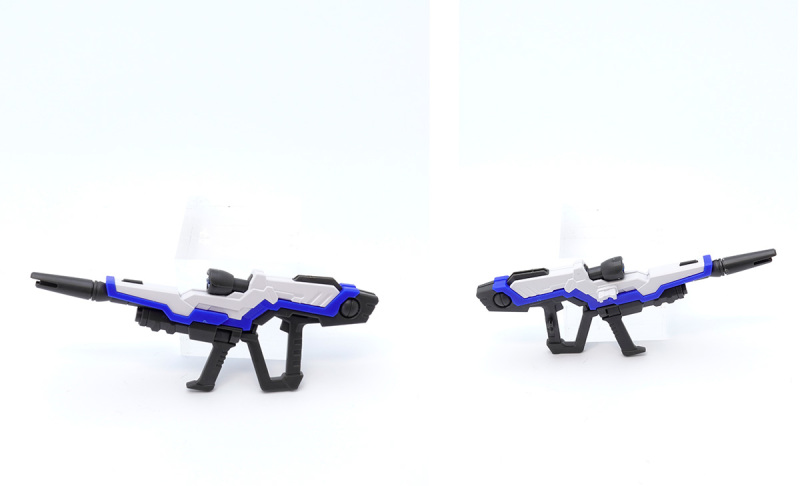 武裝部分除了翅膀上的電漿收束光束砲、腰部兩側的軌道砲能夠藉由可動機構直接展開成射擊狀態外,也附上了狼式光束步槍、兩把蜥式光束軍刀與抗光束盾牌,這三種攜行武裝就沒什麼特別的設計了,並且固定用的卡榫並沒有做額外的分件、隱藏設計,而是像一般 SD 商品那樣直接做個一體成形的突起部位。