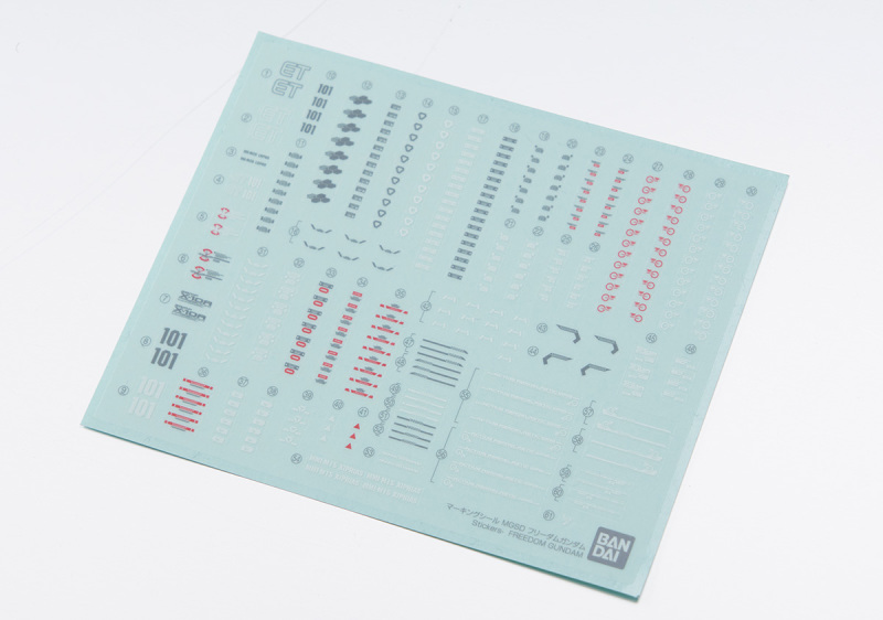 此外配件中也和 MG 商品一樣附上印有各式編號、機身標誌的貼紙,依據說明書的建議貼在機身各處,能夠為機體增添更豐富的細節!