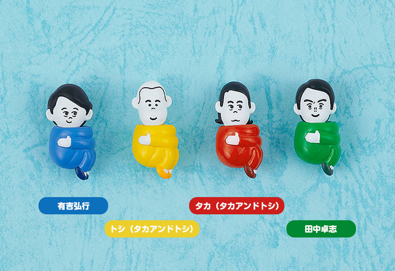 日本搞笑藝人有吉弘行主持的電玩節目《有吉eeeee!》,以有吉與藝人們一起在家實況遊戲為主軸,這次將 MC 有吉、固定班底小敏、小崇、田中卓志以節目設計的 Q 版造型立體化,尺寸全高約 3 公分,簡約的線條與俐落的配色相當可愛~附有珠鍊吊飾,可以掛在包包上隨身攜帶!