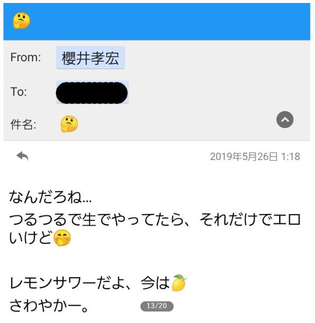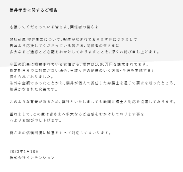而在今(18)日,櫻井孝宏的事務所 INTENTION也回應,由於在報導之前,B子提及希望得到賠償金1000萬日圓,且如果沒有在指定日期內做任何回覆,將會有大動作。而櫻井孝宏所委託的律師,以費用太高為理由拒絕賠償要求後,B子便在《週刊文春》公開爆料,目前事務所也在與專業律師進行應對。