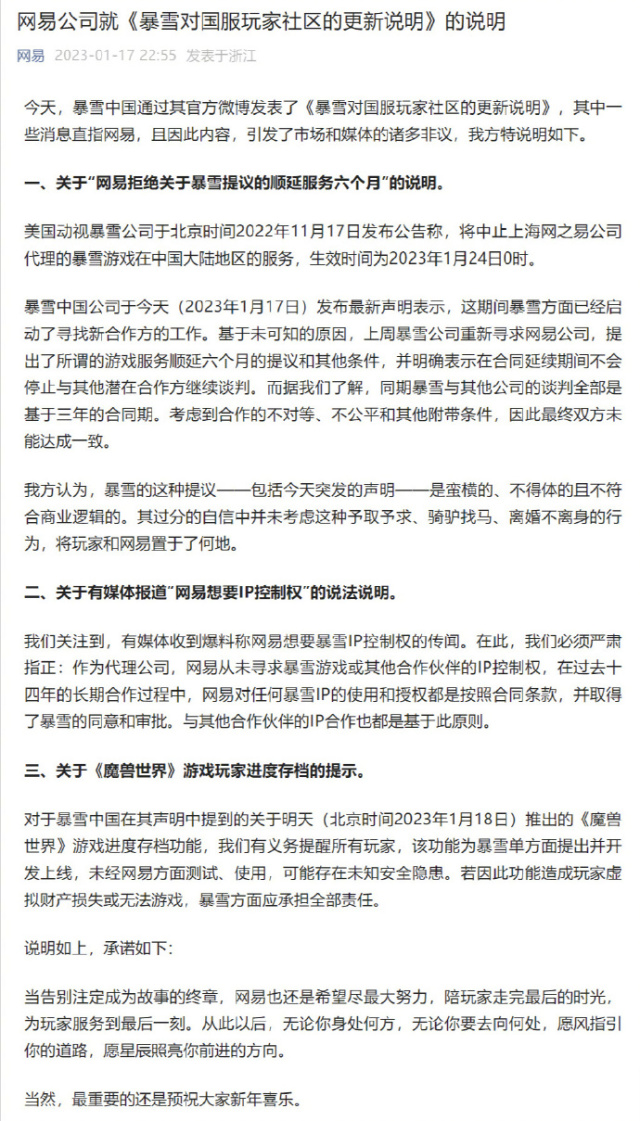 而雖然距離眾多IP即將邁入倒數,但中國暴雪方面日前以「顧及玩家遊玩體驗」為理由,表示網易拒絕「延後六個月」再分手,指控對方有意強佔IP控制權,這不只是引起玩家的爭議,在17日晚上中國網易也在微博上發文回覆關於動視暴雪的「強佔」指控。