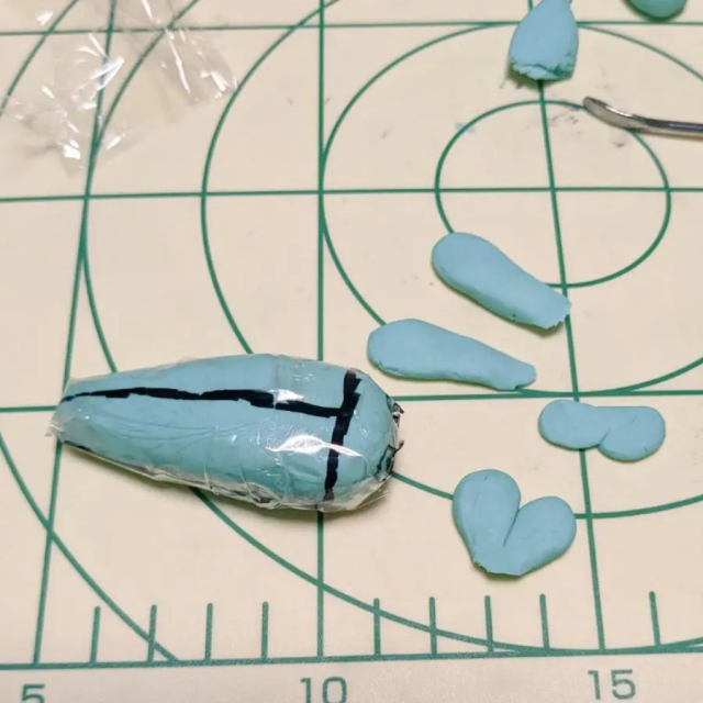 推主ふくろー ぬい工房(@owl194atelier) 是先使用黏土將米立龍的身軀先行製作出來,可以看到黏土成形之後還會纏繞膠帶 ( 或塑膠膜 ),以便後續絨布的布置。