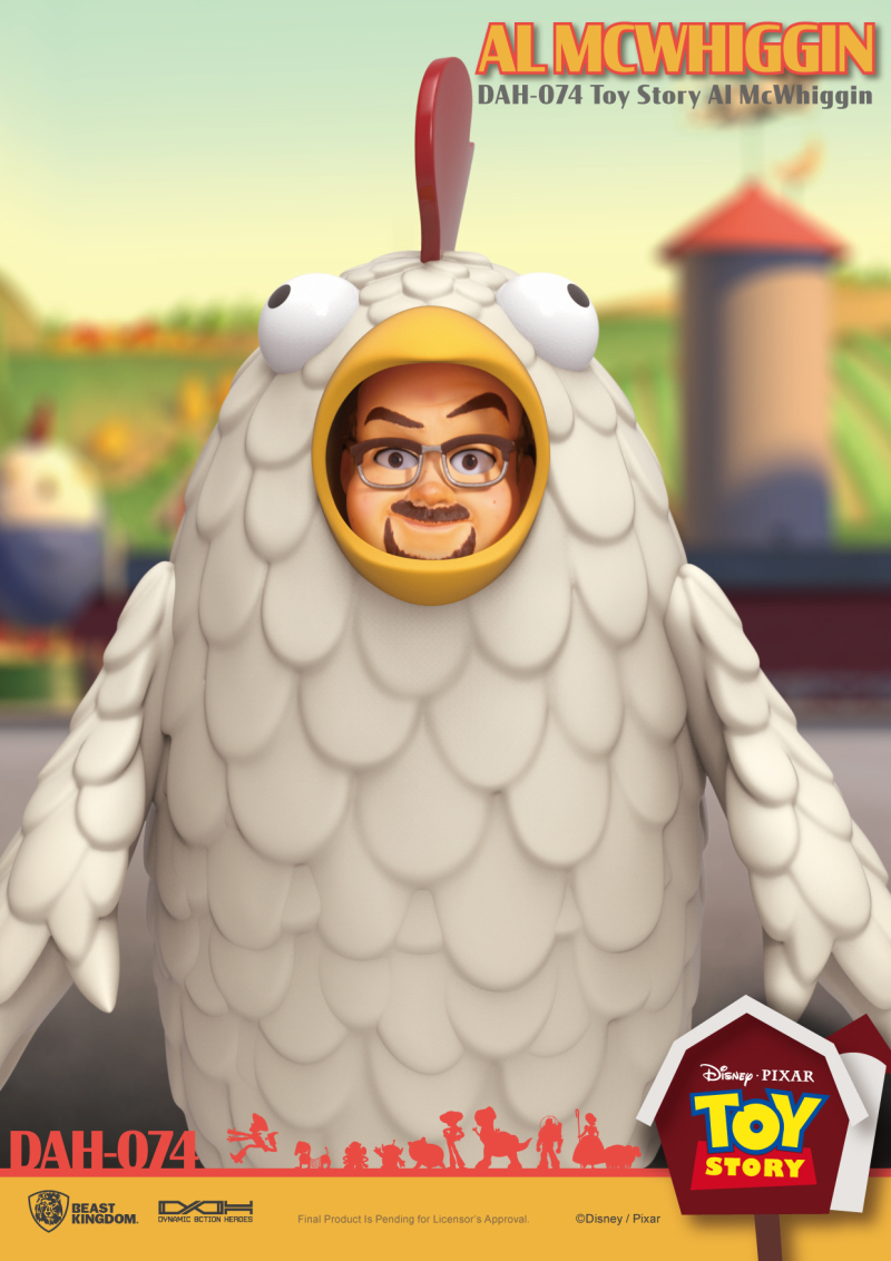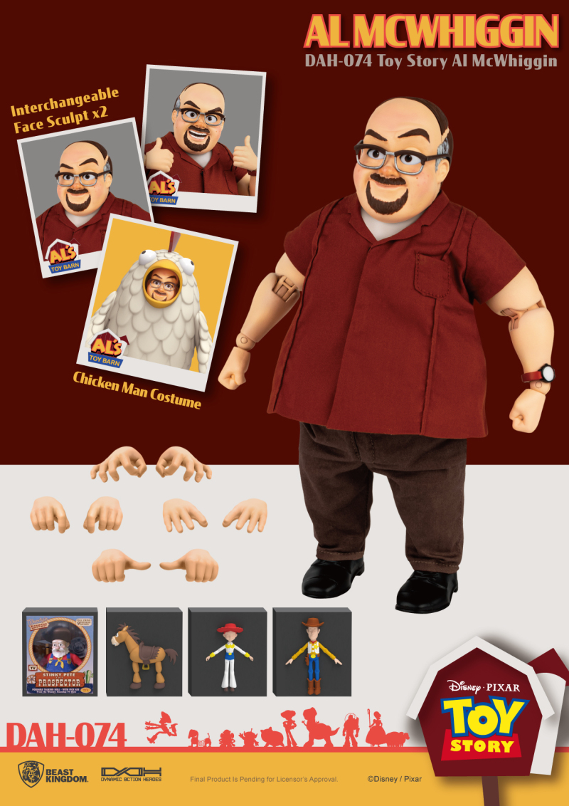 「DAH 艾爾」高約 18.5 公分,擁有 16 處可動,在打造出他身為中年胖大叔圓滾身形的同時,以布料縫製出身上那套紅短袖襯衫與褐色長褲的經典搭配,本作另外附上的艾爾玩具倉庫公雞裝則是以塑料製作,頭雕有普通、笑臉兩種表情,眼鏡是可拆卸的獨立零件,其它配件包含「胡迪」、「紅心」、「翠絲」放在黑色海綿裡的迷你模型(PVC)、「邋遢彼得」玩具盒(紙)、手錶、多個替換手,除了可以重現艾爾想要賣掉胡迪他們的場面之外,穿上公雞裝更是讚到不行,要收要收。