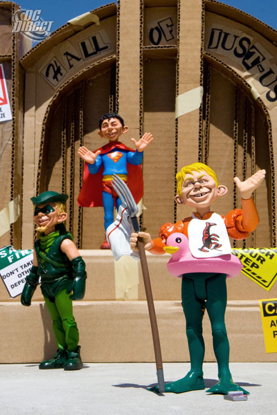 1952年創刊至今的超級老牌幽默漫畫雜誌"MAD"將在明年2012年迎接60週年!為了慶祝這個特別的日子,"MAD"雜誌與出版"蝙蝠俠"、"超人"以及"綠燈俠"聞名全球的漫畫雜誌社DC Direct合作,將"MAD"雜誌的主角"ALFRED E. NEUMAN"打扮成各種超級英雄的模樣製作成可動玩具,並把系列取名為"Just-Us-League of Stupid Heroes"開了"Justice League"(正義聯盟)一個玩笑!其實過去這個系列有在1998年推出過,當時推出了超人(與克利普奈項鍊)、蝙蝠俠、羅賓、綠箭、綠燈俠以及閃電俠。