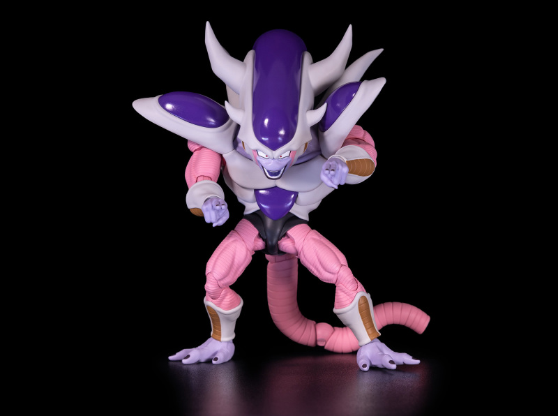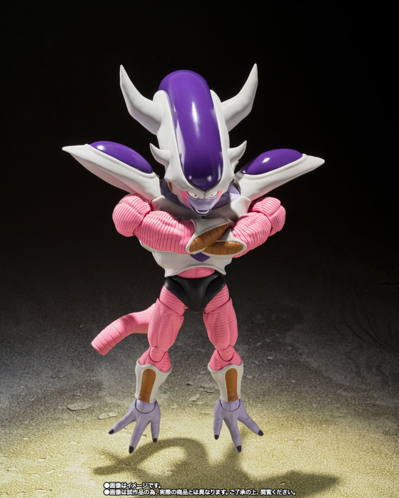 「S.H.Figuarts 弗利沙 第三形態」可動人偶,尺寸全高約 15 公分,還原採用三段變身中「第三型態」時肌肉更加膨脹、身體向兩側發展、背後尖刺突出,頭部拉長的類異形造型。附有叫喊臉、笑臉兩種替換表情零件,營造出討人厭的神韻;另外還有張開手、握拳與使出招式等多款替換手勢與漂浮、站立的替換腳等,以及令人印象深刻的招式特效件,賞玩攻擊場景!施以閃亮珠光的那美克星版大龍珠(六星球)也附屬登場!