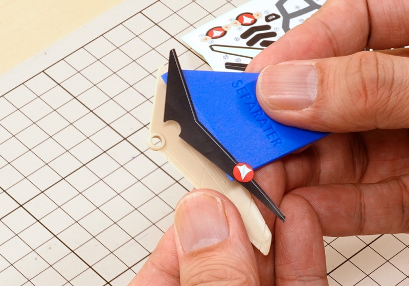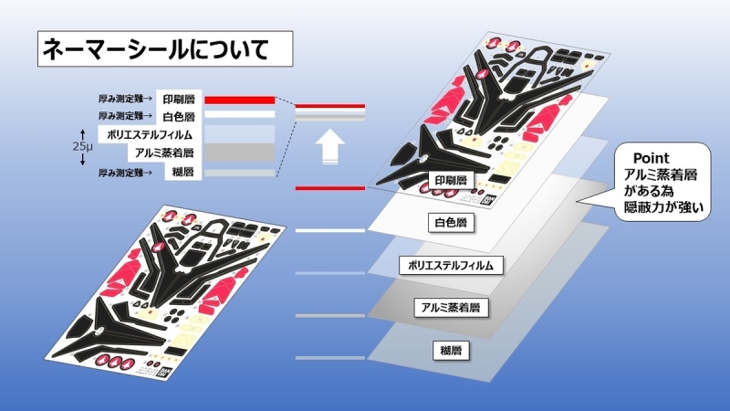 此外內附的兩種補色貼紙也和以外在鋼普拉商品中常見的構造不同,採用在 PET 膠片上施以鋁蒸鍍的材質製作,依據發色需求分別有五層構造的白底、四層構造的銀底兩種,擁有極薄、高遮蓋力、發色鮮豔等特徵,能夠幫助不上漆素組玩家再現機身上各種色彩與標誌!