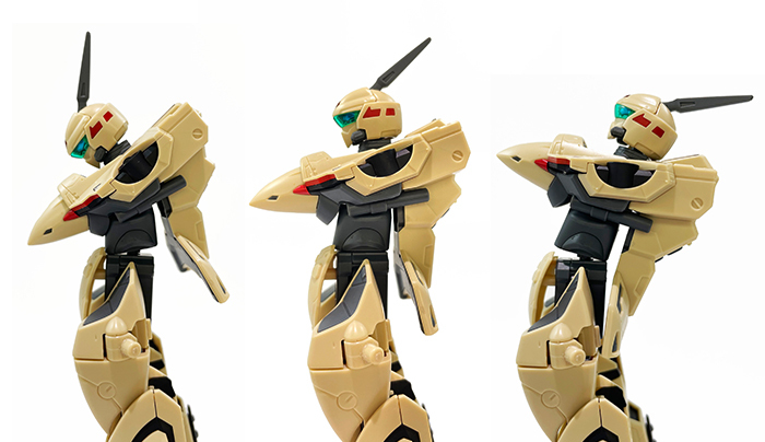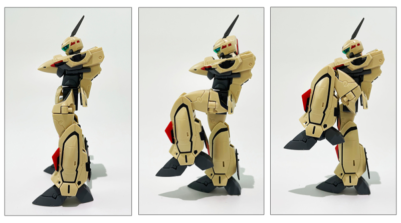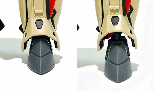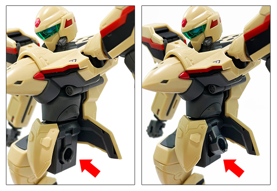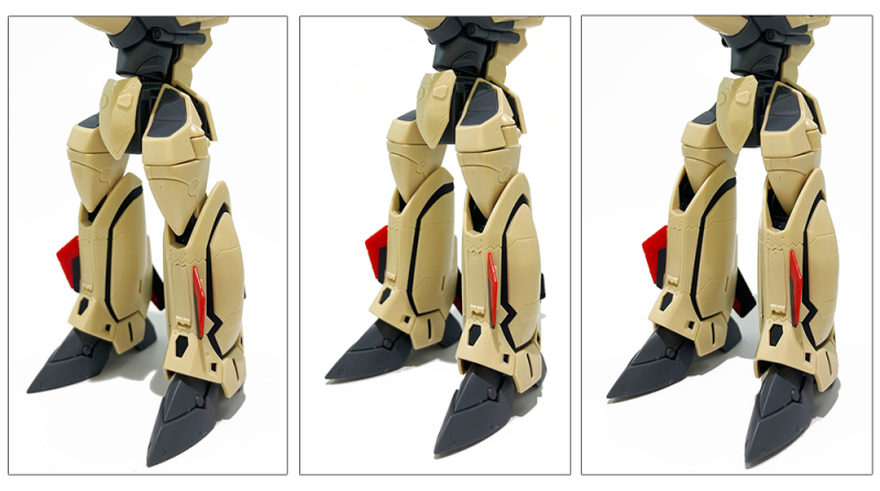 膝關節部分也依據三段變形的需求,能藉由多軸可動關節變化膝關節位置,進一步提升整體腿部的可動性,平時便能將膝蓋抬至胸口附近,即使作出有點難度的高跪姿依然能夠維持平衡與帥氣的體態。