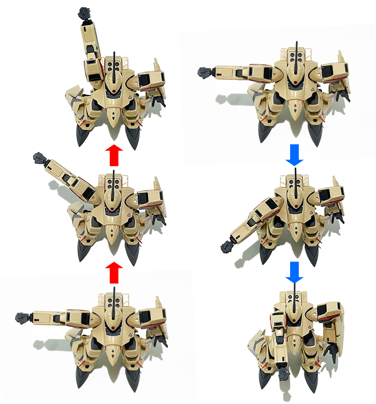 此次官方也展示了全身各關節的可動範圍,包含肩關節具備前後水平、垂直各約 180 度的可動範圍、胸腰部的多軸可動能夠大幅前屈後傾、拉出式髖關節能夠進一步提升雙腿張開的幅度、腳踝則有延長構造可減少裝甲干涉提升腳掌的接地。
