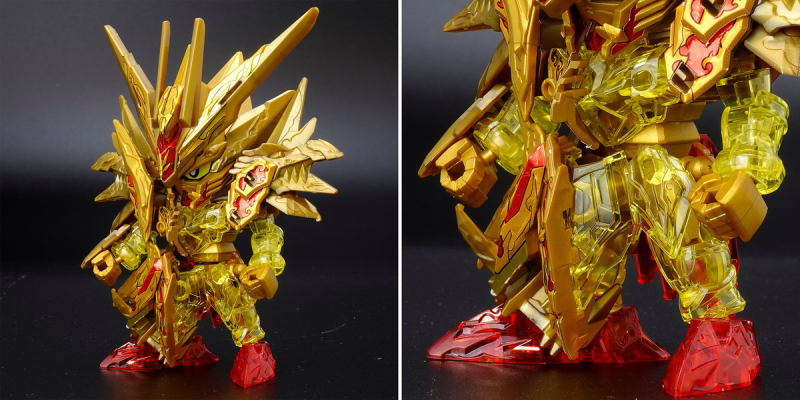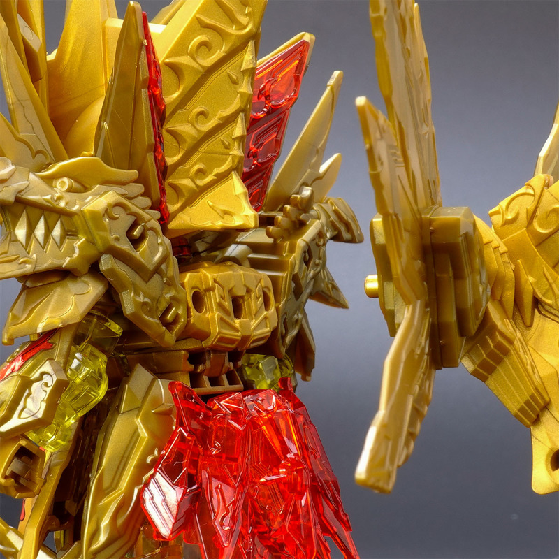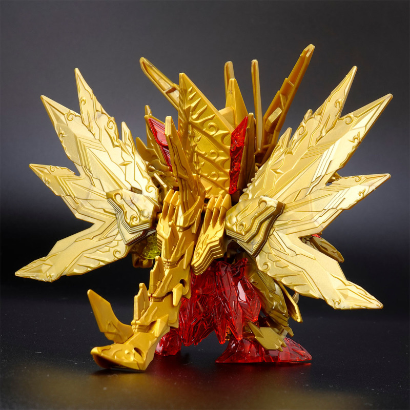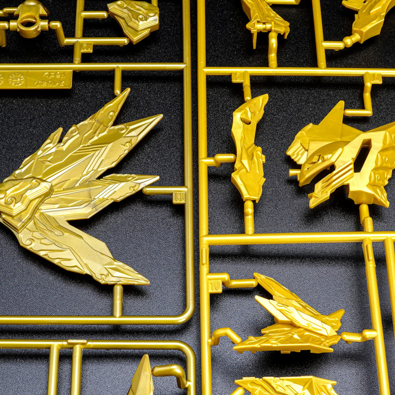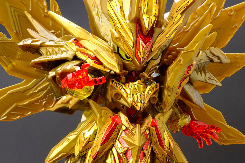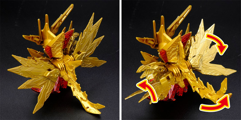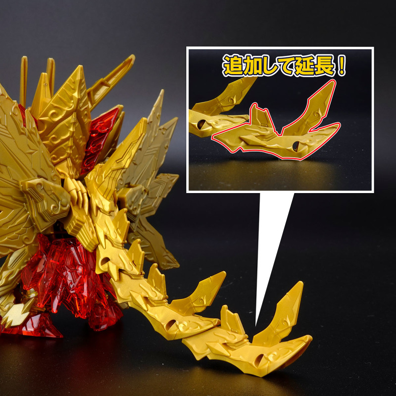 加上可動的翅膀與尾巴後,金色身軀的份量看起來相當豪華,若有多組套件還能將尾巴無限延長,搭配透明紅成形的手掌便能再現施展必殺技的姿態。而整體骨架構造基本與騎士攻擊鋼彈共通,因此多數零件都能與騎士攻擊鋼彈互換進行改裝。此外套件中還包含目前用不到、但能與未來發售商品搭配使用的零件,留下合體或強化的伏筆。