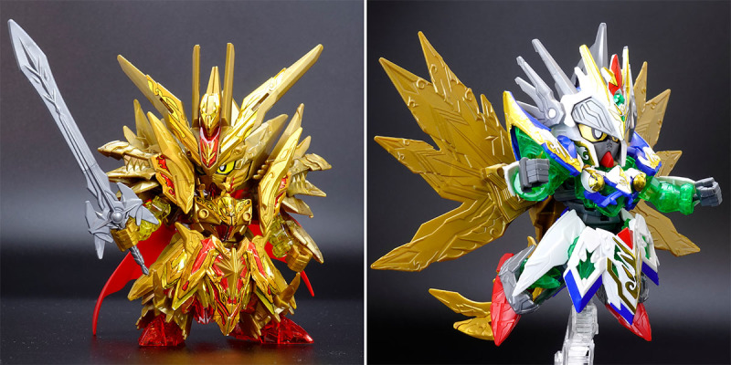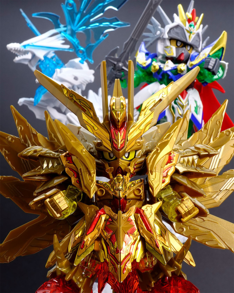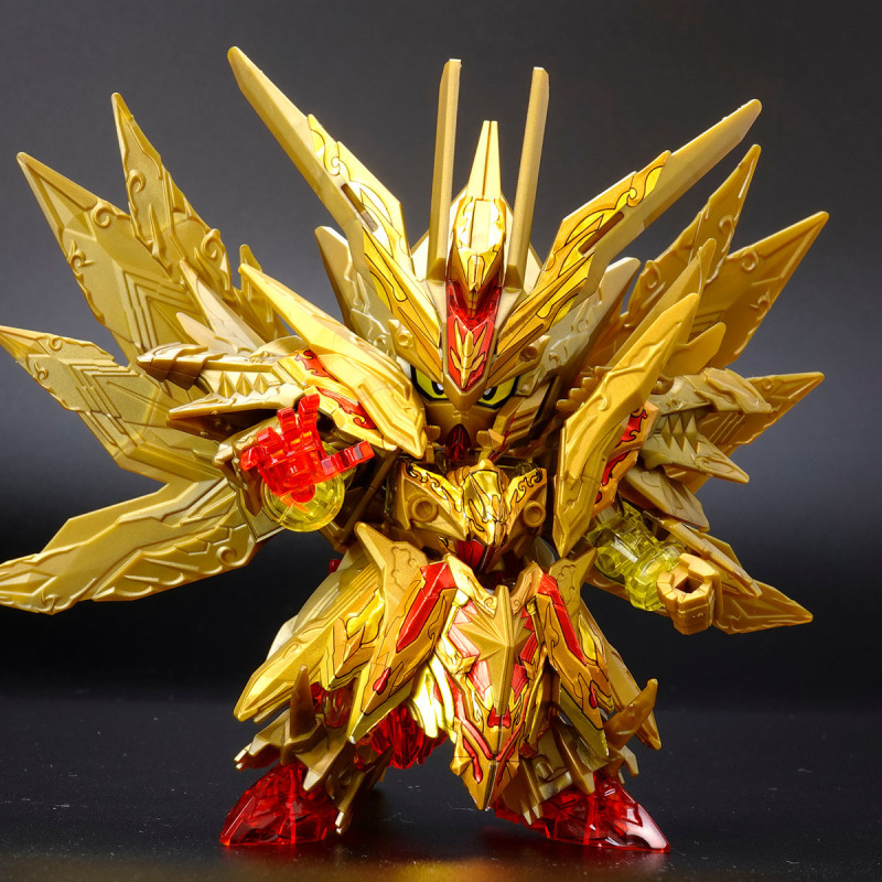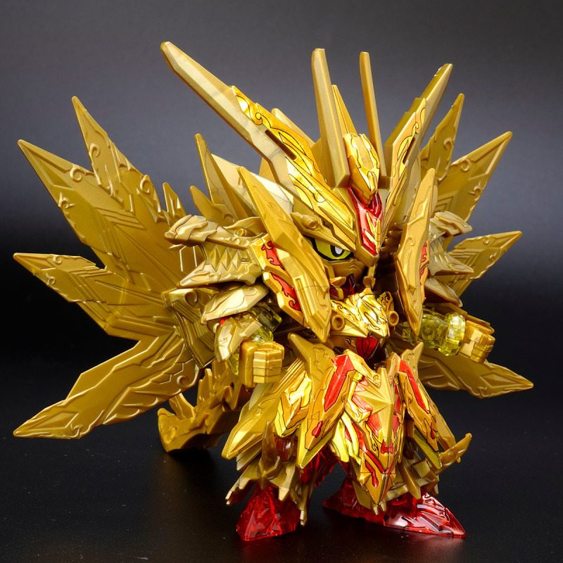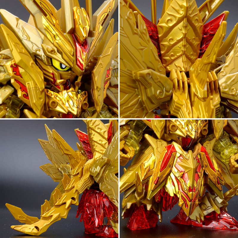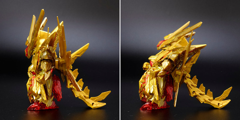 加上可動的翅膀與尾巴後,金色身軀的份量看起來相當豪華,若有多組套件還能將尾巴無限延長,搭配透明紅成形的手掌便能再現施展必殺技的姿態。而整體骨架構造基本與騎士攻擊鋼彈共通,因此多數零件都能與騎士攻擊鋼彈互換進行改裝。此外套件中還包含目前用不到、但能與未來發售商品搭配使用的零件,留下合體或強化的伏筆。