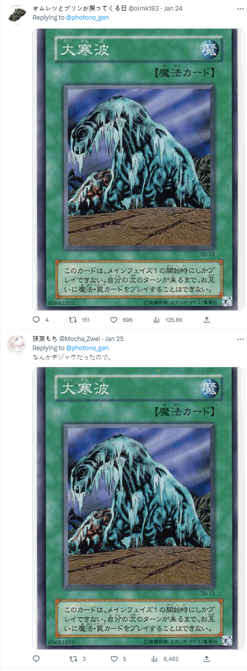 當然不意外的,立刻也讓想起了這張遊戲王卡牌「大寒波」...幾乎完全一致啦 XD。
