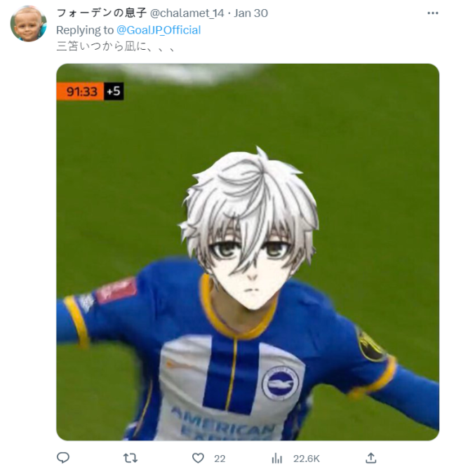 雖然世界盃足球賽已經落幕一段時間,不過對於足球迷來說一點也不寂寞,現在歐洲各俱樂部比賽仍在進行,也有不少日本足球員在歐洲征戰中。而 1 月 29 日的足總盃比賽中,代表布萊頓的三笘薫在對上利物浦的比賽中,展現了華麗的「二段式凌空射門」,關鍵時刻踢進致勝一球 ,帥氣的表現也讓日本網友大讚 : 「 根本是《藍色監獄》的凪!」 。