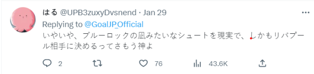 這球也讓日本球迷想到《藍色監獄》漫畫中,被譽為天才之一的凪展現的「二段式凌空射門」,宛如漫畫的技術,果然藍色監獄都是真的 XD。