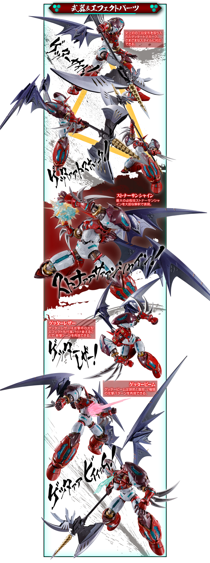 武裝配件部分這次算是誠意十足,招牌的蓋特戰斧搭載全新的原創三段變形機構,能夠藉由刀刃零件的變形再現戰斧、戰戟、鐮刀三種形態。雙腕搭載的蓋特腕刃可藉由替換零件變換為更加延長的大型刀刃。此外還有多種施以珍珠色、漸層塗裝的光束特效零件,能夠再現頭部蓋特光束、腹部蓋特光束,以及極具魄力的必殺技「蓋特烈日彈」!