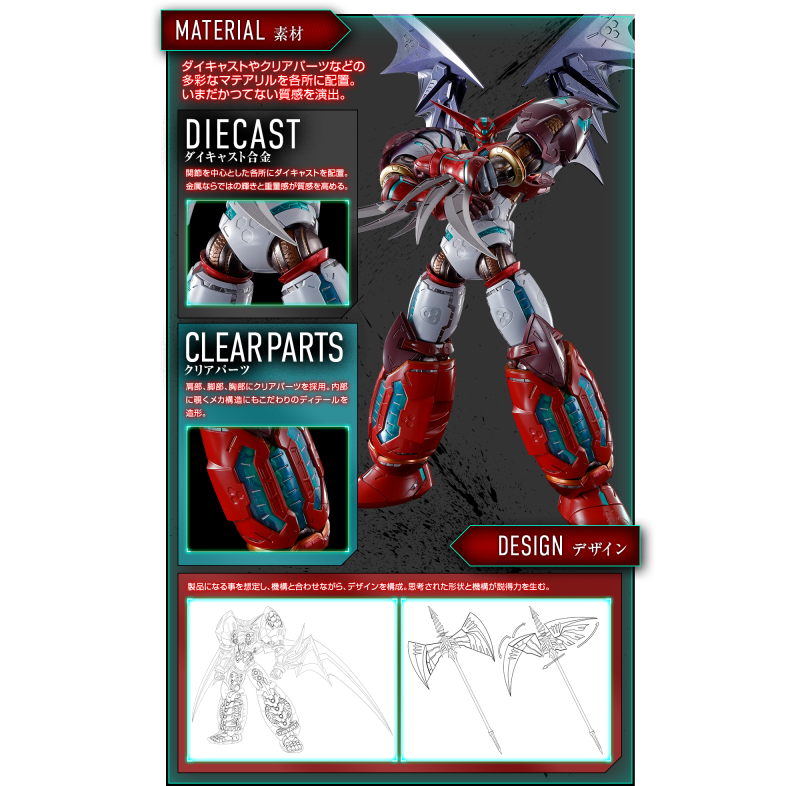 「METAL BUILD DRAGON SCALE 真蓋特1」整體最大高度約 45 公分(含翅膀),全身多處關節零件採用兼具強度與重量感的合金材質製作,各處透出蓋特線的綠色裝甲則使用透明綠零件呈現,並能透出內部精密的機械內構造型,整架真蓋特1的裝甲造型極具厚重感。