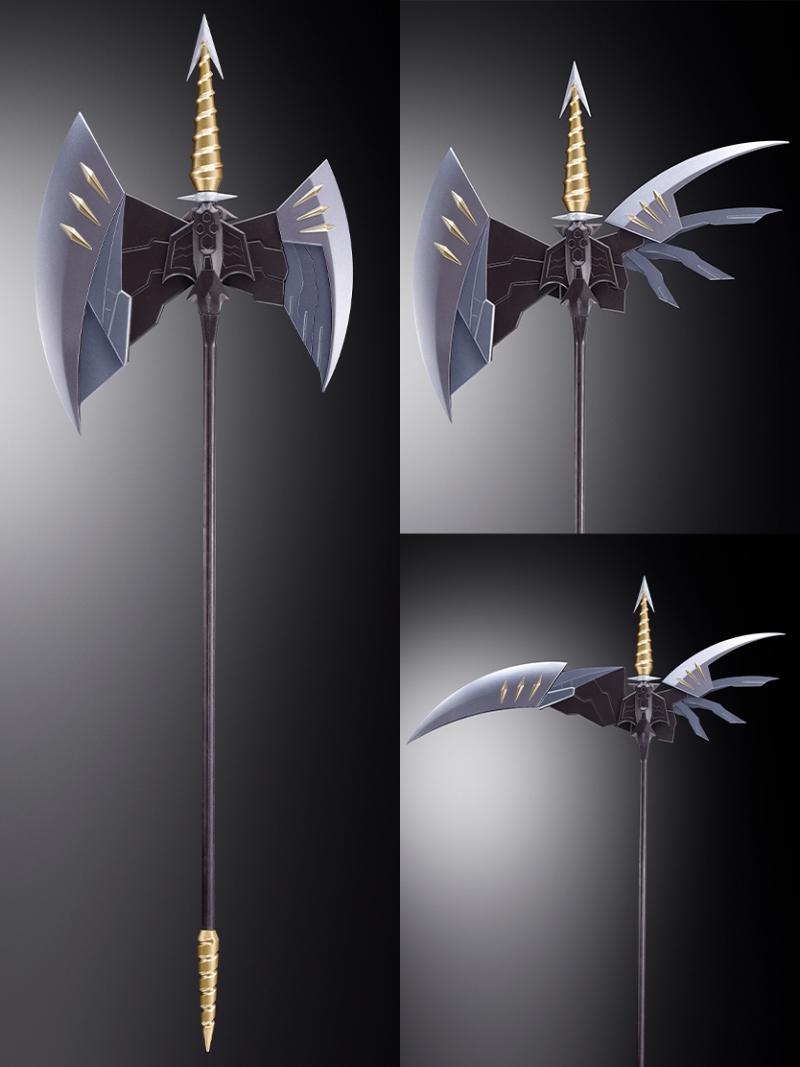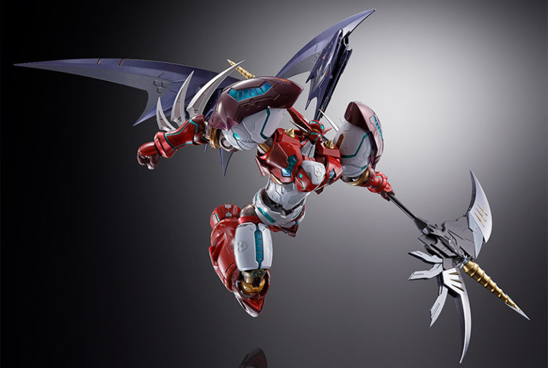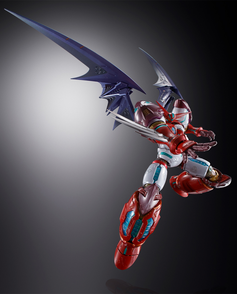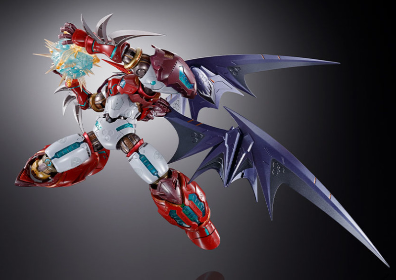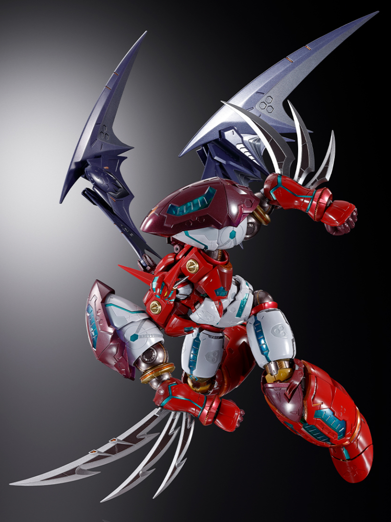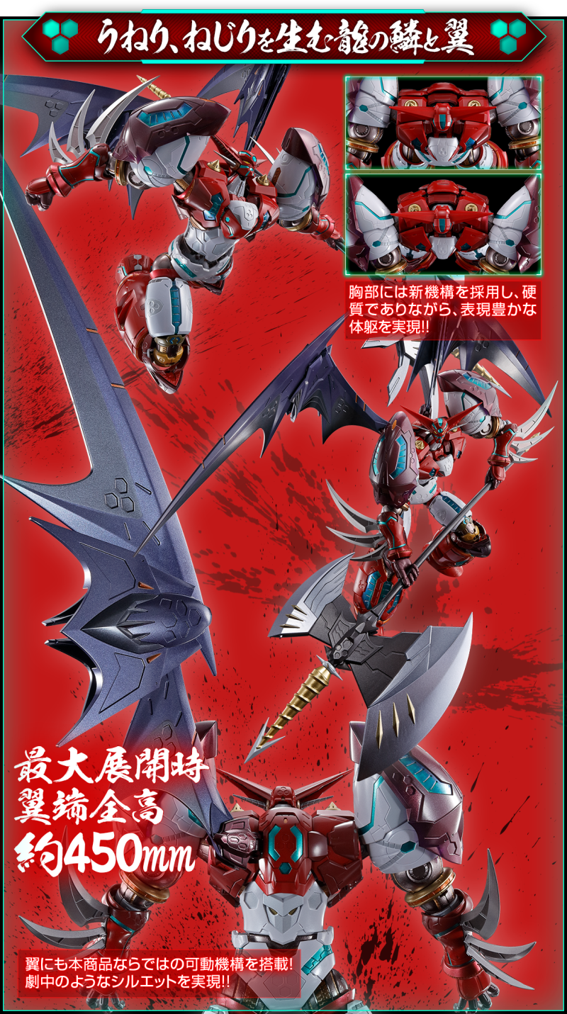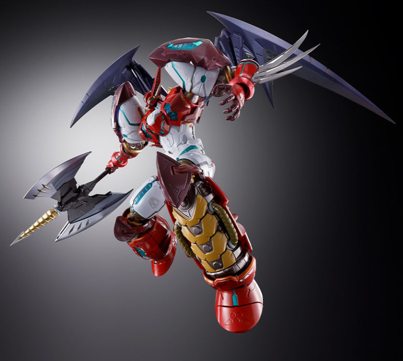 此外部分關節周圍的裝甲也設計出裝甲連動機構,能夠隨著關節作動時彷彿肌肉般滑動,其中肩關節的全新設計更加表現雙臂向前彎曲時背部擴張、胸部收縮的姿態,把玩出極具魄力的姿態。而極具機械感的銳利翅膀也採用三層零件構成,展開後能夠大幅向上抬升,達成全高 45 公分極具份量的尺寸。