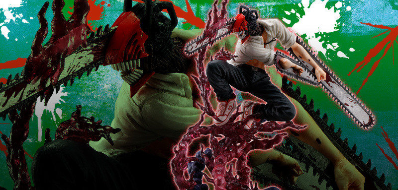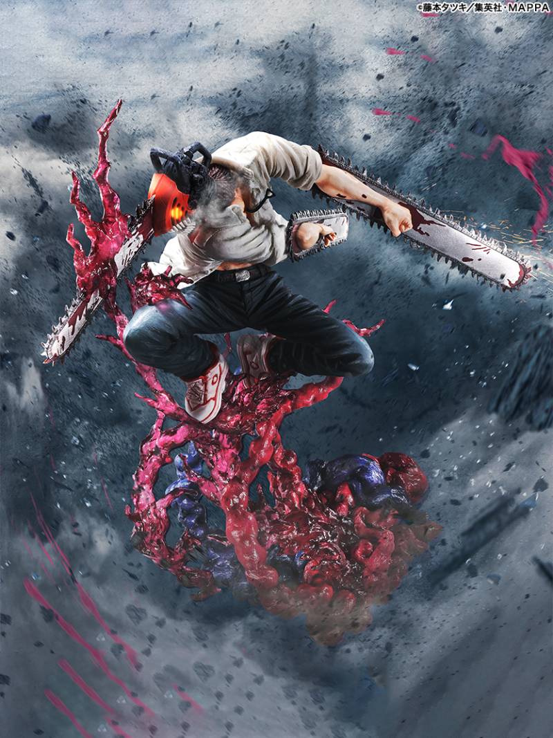 「Figuarts ZERO 鏈鋸人」PVC塗裝完成品,尺寸全高約 21 公分,以劇中和蝙蝠惡魔戰鬥的場面為基礎,刻劃出淀治變身鏈鋸人大開殺戒的躍動姿勢!使用血紅色透明特效件營造出血淋淋的臨場感,並由伴隨著的內臟、腸子打造成底座,讓鏈鋸人呈現躍身於空中的模樣;在飄揚且充滿皺褶的制服、頭上的刮痕、血跡塗裝與襯衫下的肌肉線條等都有豐富的細節!