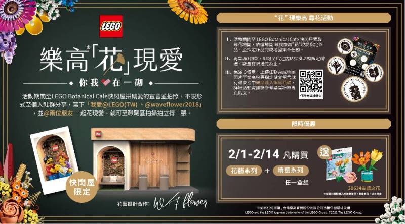 台灣樂高與浪花花藝用樂高花藝系列新品「10313野花花束」及「10314乾燥花擺設」攜手打造樂高「花」現愛咖啡屋,快閃活動於即日起至2月14日間於信義誠品1樓戶外推出期間限定活動,邀請消費者沉浸在浪漫花藝的生活氛圍,用樂高花藝系列擁抱情人節。