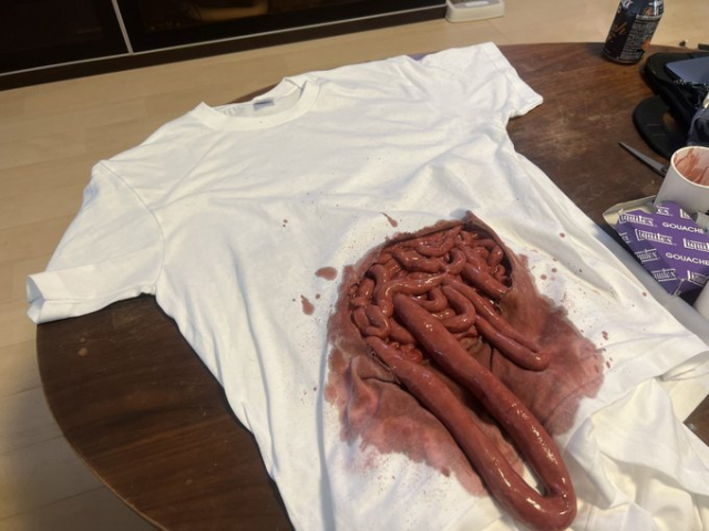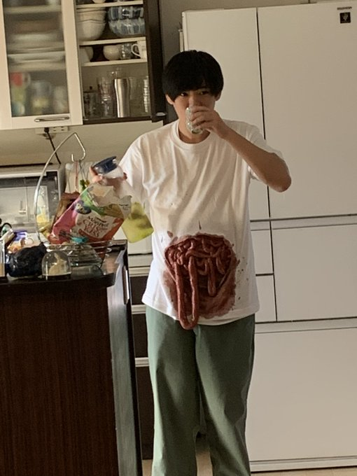 擅長創作的他對於人體器官有著莫名喜愛,先前更製作出臟器噴出的衣服,曾經也在推特上引起網友關注,還掀起購買風潮 XD。( 這種商機居然也有 )