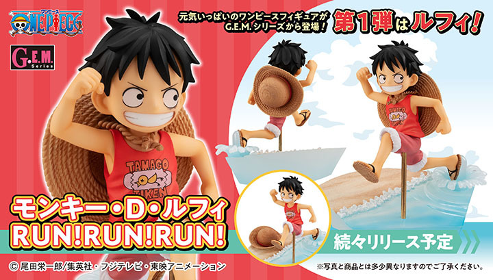 「G.E.M. 蒙其・D・魯夫RUN!RUN!RUN!」PVC塗裝完成品,以《ONE PIECE 航海王》前期動畫的片尾曲《RUN!RUN!RUN!》為靈感,將童年時期魯夫立體化!淘氣在海邊奔跑的模樣與臉上招牌的笑容相當可愛,腳底踏出的水花特效增添動態感~除了服裝的細節之外,脖子上掛著的大草帽可以取下~頸部設計有可動球型關節,能調整不同角度!