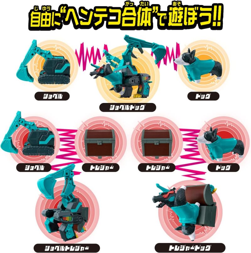 三種毫無關聯的機械、物品與生物,都夠透過異想天開的合體結構進行連結,只要將特定連接部位合體便會自然彈開、變形,接著再手動展開部分部位,就能合體出全長約 24 公分的帥氣飛龍型機器人!此外也能兩兩組合搭配出「怪手寶箱」「怪手狗」「寶箱狗」三種不同的合體形態,可玩性更加豐富!