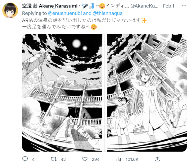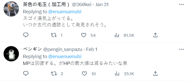 這樣的景色很像古代遺跡外,也有網友開玩笑表示這像是冒險遊戲的溫泉,泡了可以回復 MP 但是會減少 HP 最大值 ( ? )