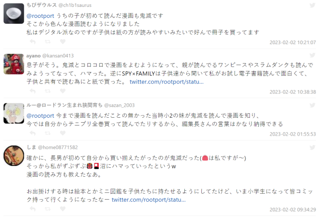 由於現在電子書在日本越來越興盛,實體漫畫真的需要契機才能爆賣,而鬼滅也重新帶動了大家購買的風氣。除此之外,因為科技社群的演進,也讓不少小朋友從 YouTube 或是 TikTok 上認識了鬼滅,更是成為讓他們接觸漫畫的先驅,開始對漫畫開始產生了興趣,讓這代小孩學會「怎麼看漫畫」 。