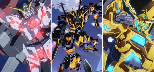 三款分別為 : 1 號機「RX-0 獨角獸鋼彈」、2 號機「報喪女妖」以及 3 號機「鳳凰」。這三架機體分別登場在《機動戰士鋼彈 UC》與續篇《機動戰士鋼彈 NT》,雖然都叫做獨角獸鋼彈,但三架不論是外型與天線設計都大不相同,但都是非常高人氣的機體。