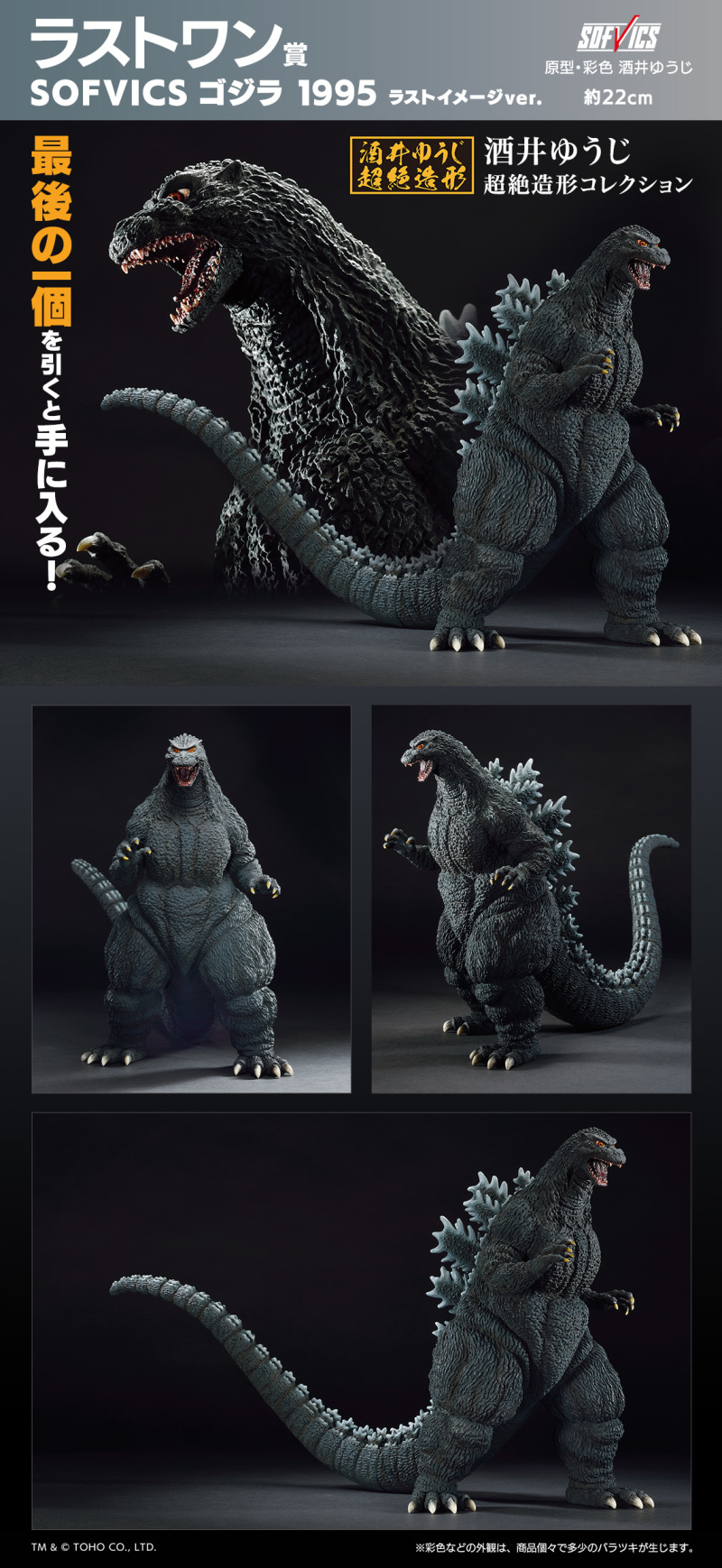 其中最大獎 A 賞「酒井裕司超絕造型收藏 SOFVICS 紅蓮哥吉拉 香港上陸ver.」是由日本哥吉拉造型家第一人酒井裕司擔任原型、上色製作,將過去發表的「30cm哥吉拉1995香港上陸」原型進行超高精度的 3D 掃描,重新製作成全高 22 公分的軟膠模型,徹底再現電影《哥吉拉vs戴斯特洛伊亞》開頭,哥吉拉從香港登陸大肆破壞的兇猛形象!
